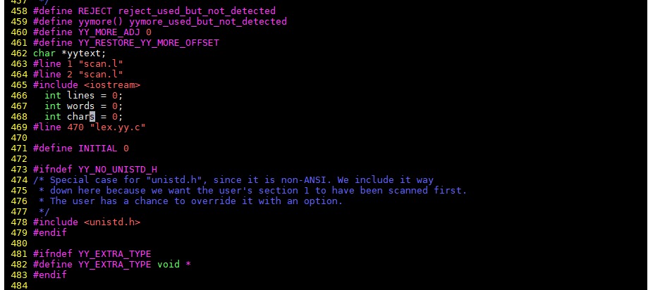 第二部分,每个模式在第一行的开头位置,而后面是模式匹配时所需要执行程度C代码。这里的C代码就是{