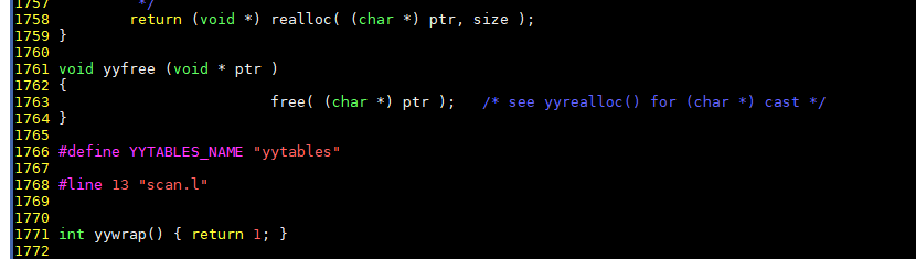 代码,会被拷贝到生成的词法分析器(对应代码是由scan.l