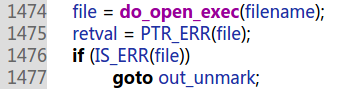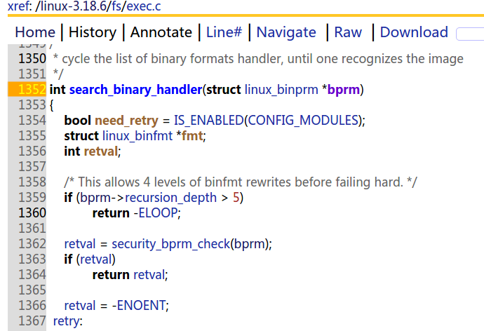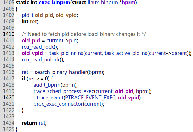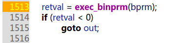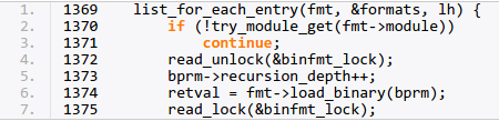 在该函数中, 可以看到调用了search_binary_handler(bprm)函数,该函数寻找符合文件格式对应的解析模块.